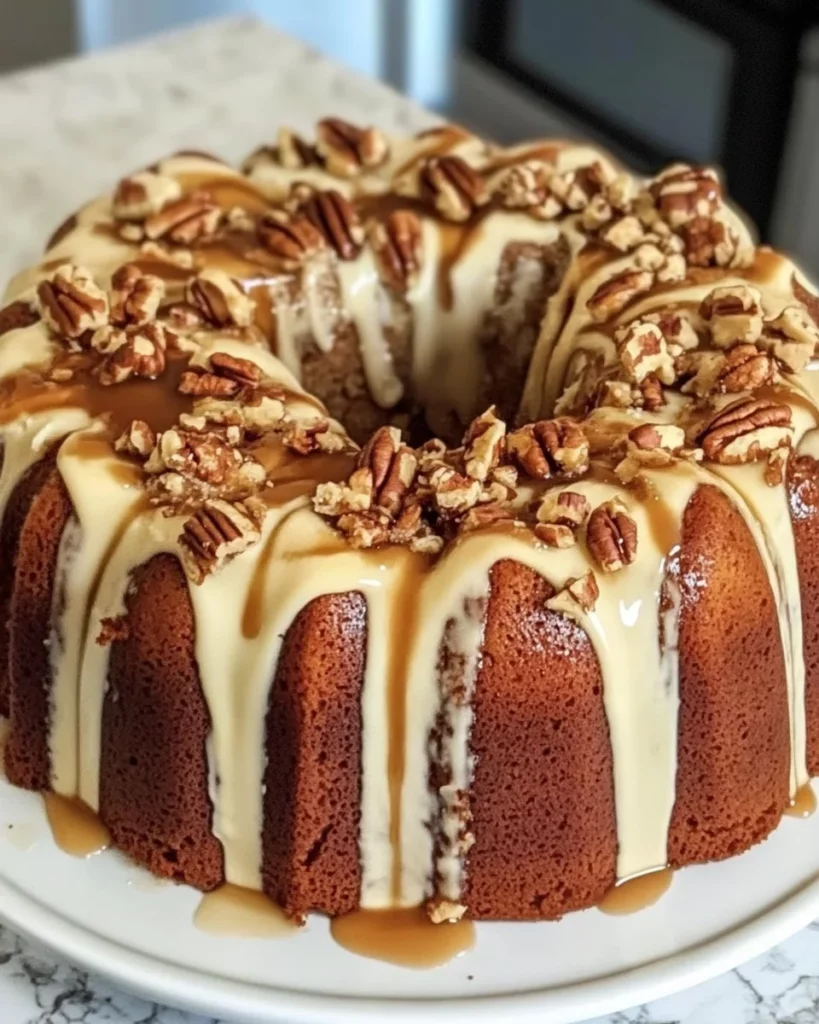 - Once the cake is completely cool, drizzle the caramel-cream cheese glaze over the top, letting it drip dramatically down the sides.