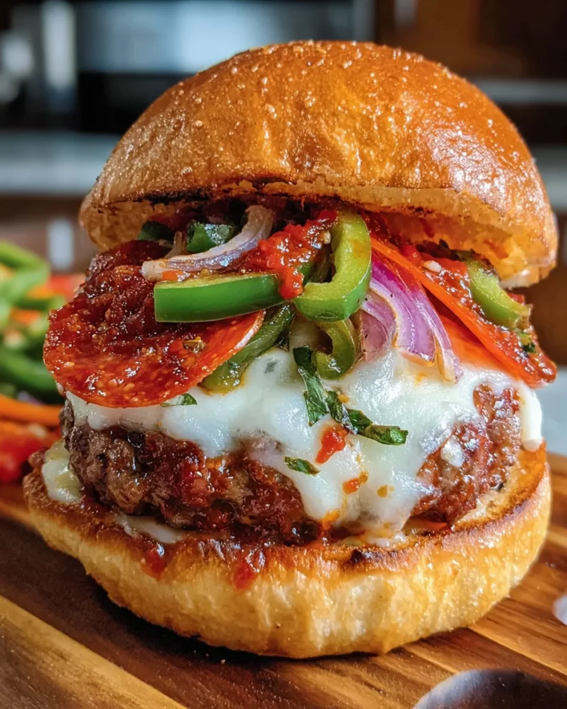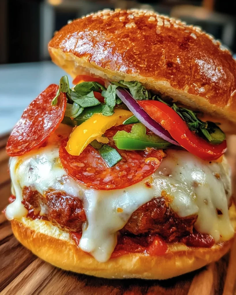 A delicious and flavorful burger featuring pepperoni, provolone cheese, and sautéed vegetables served on a brioche bun.