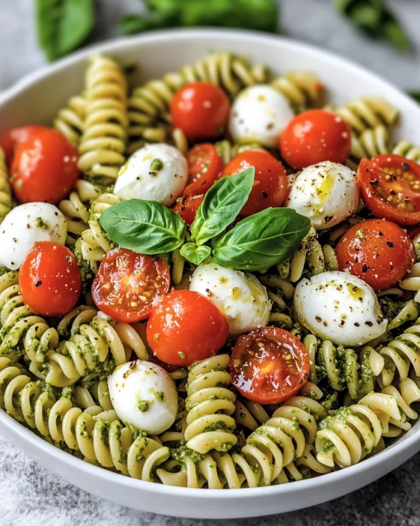 A refreshing and vibrant Pesto Caprese Pasta Salad that combines the flavors of fresh tomatoes, mozzarella, and vibrant pesto for a perfect meal or side dish.