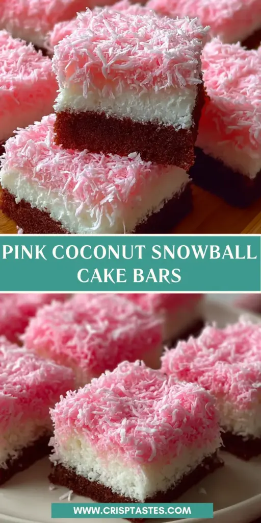 Creating these Pink Coconut Snowball Cake Bars is more than just baking; it’s a joyful experience that brings warmth and sweetness to any gathering. Each bite is a delightful contrast of rich chocolate and fluffy coconut. They are perfect for busy days and special occasions alike. As you slice into these vibrant bars, I hope you feel the love and care that went into making them. And trust me—the smiles received in return are worth every moment spent in the kitchen. Happy baking, and may your treats always be as sweet as your memories!