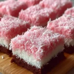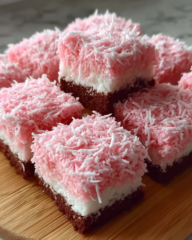 Delicious Pink Coconut Snowball Cake Bars with a rich chocolate base and a vibrant pink coconut topping, perfect for any occasion.