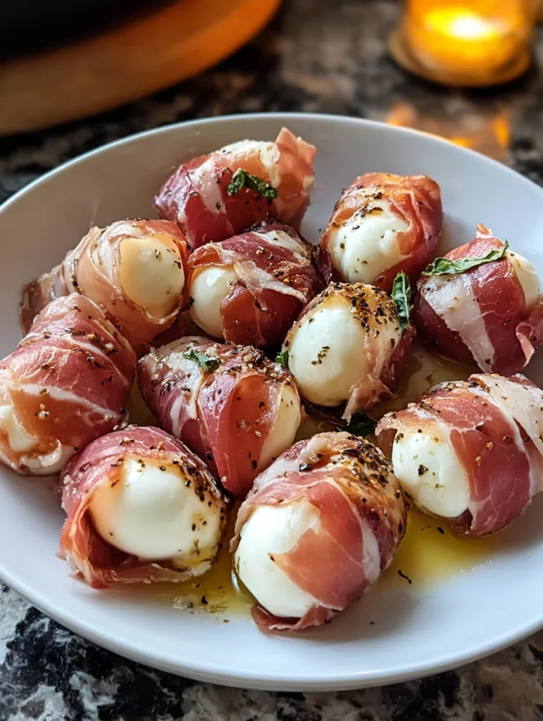 - Serve immediately and enjoy the warm, savory prosciutto-wrapped mozzarella bites.