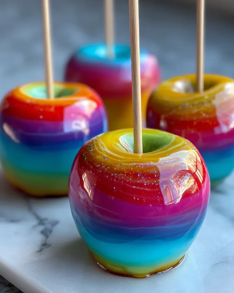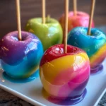 Delightful Rainbow Candy Apples that create a colorful and fun treat for kids and adults alike.