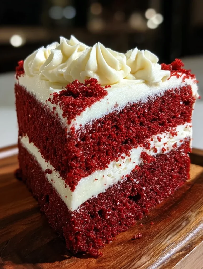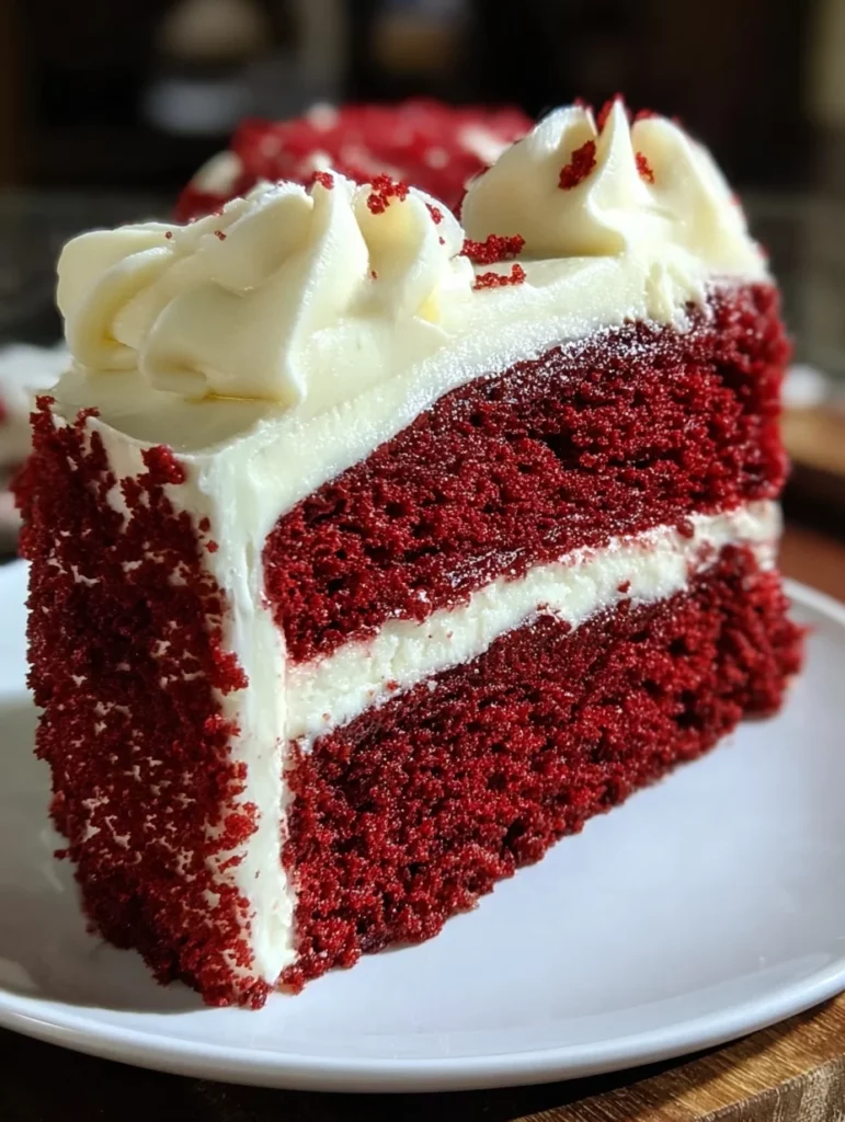 A rich and moist Red Velvet Cake topped with a creamy cream cheese frosting. Perfect for any celebration!