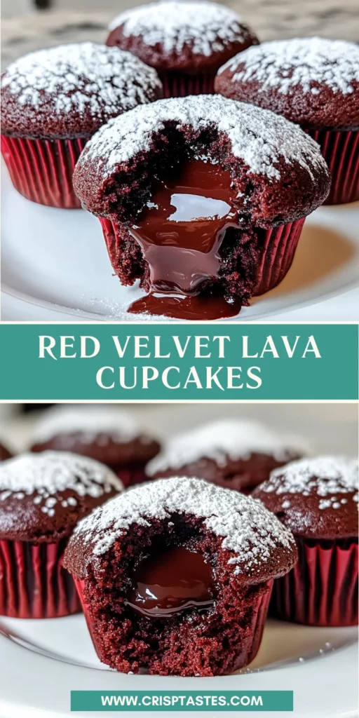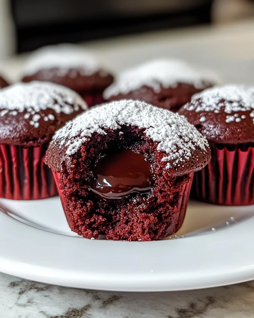 Delicious red velvet cupcakes with a molten chocolate center, perfect for indulgent desserts.