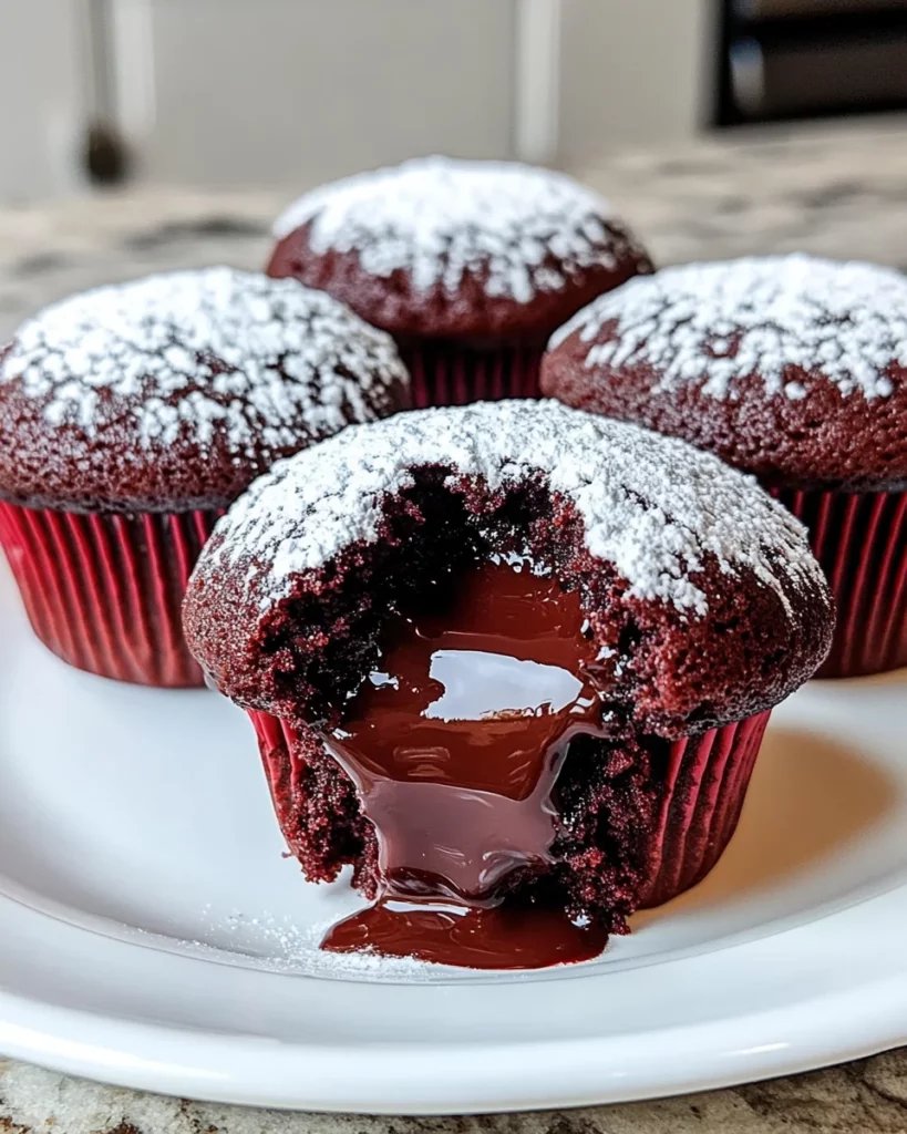 Delicious red velvet cupcakes with a molten chocolate center, perfect for indulgent desserts.