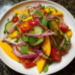 - Combine Ingredients: In a large salad bowl, combine the sliced mango, red onion, cucumber, red bell pepper, and cherry tomatoes. Add the chopped cilantro and mint leaves.