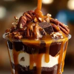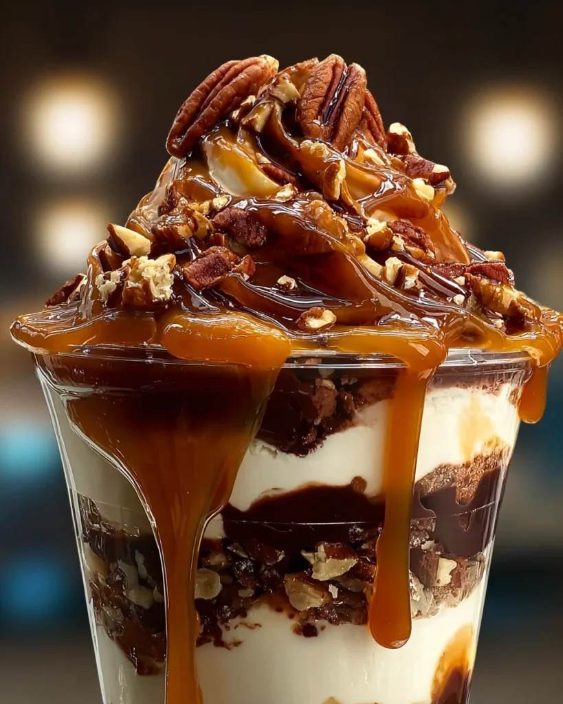 - Top each cup with extra brownie pieces, a generous drizzle of caramel, and toasted pecans.
