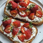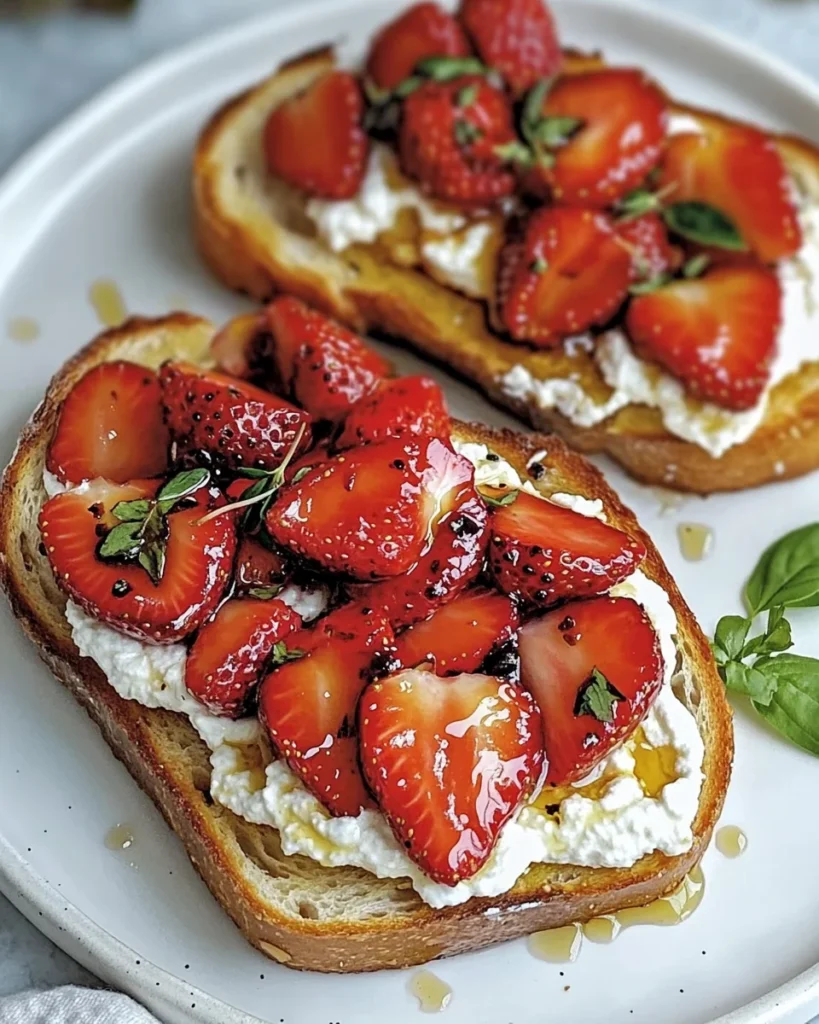 A delightful combination of roasted strawberries and creamy ricotta served on crusty bread, perfect for brunch or a light dessert.