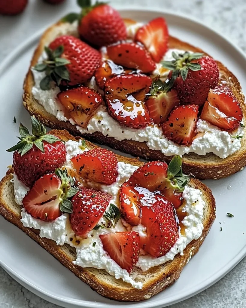 A delightful combination of roasted strawberries and creamy ricotta served on crusty bread, perfect for brunch or a light dessert.