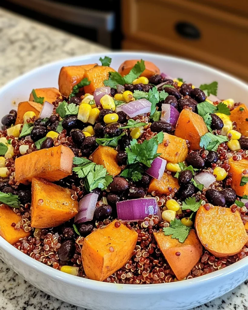 A delightful and nutritious salad featuring roasted sweet potatoes, black beans, and quinoa, perfect for any meal.