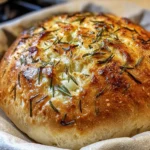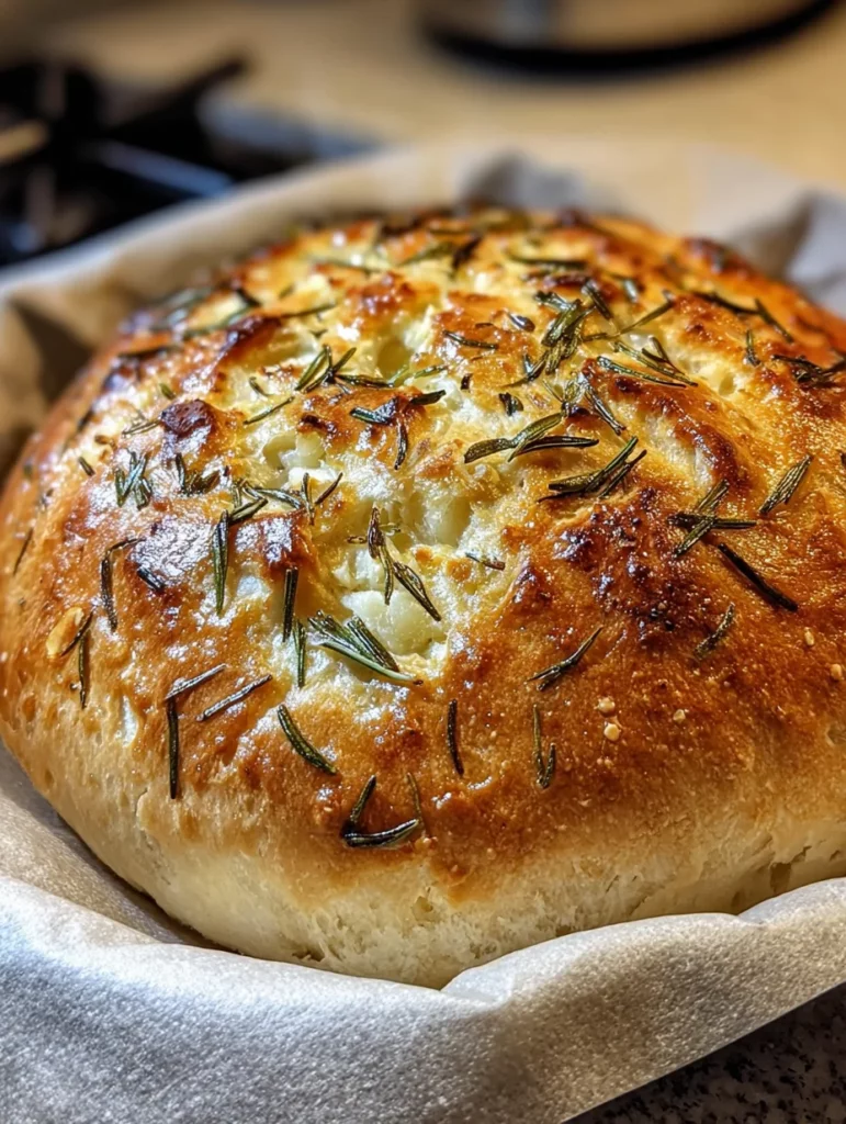 A delicious, crusty bread infused with the flavors of rosemary and garlic, made effortlessly without kneading.