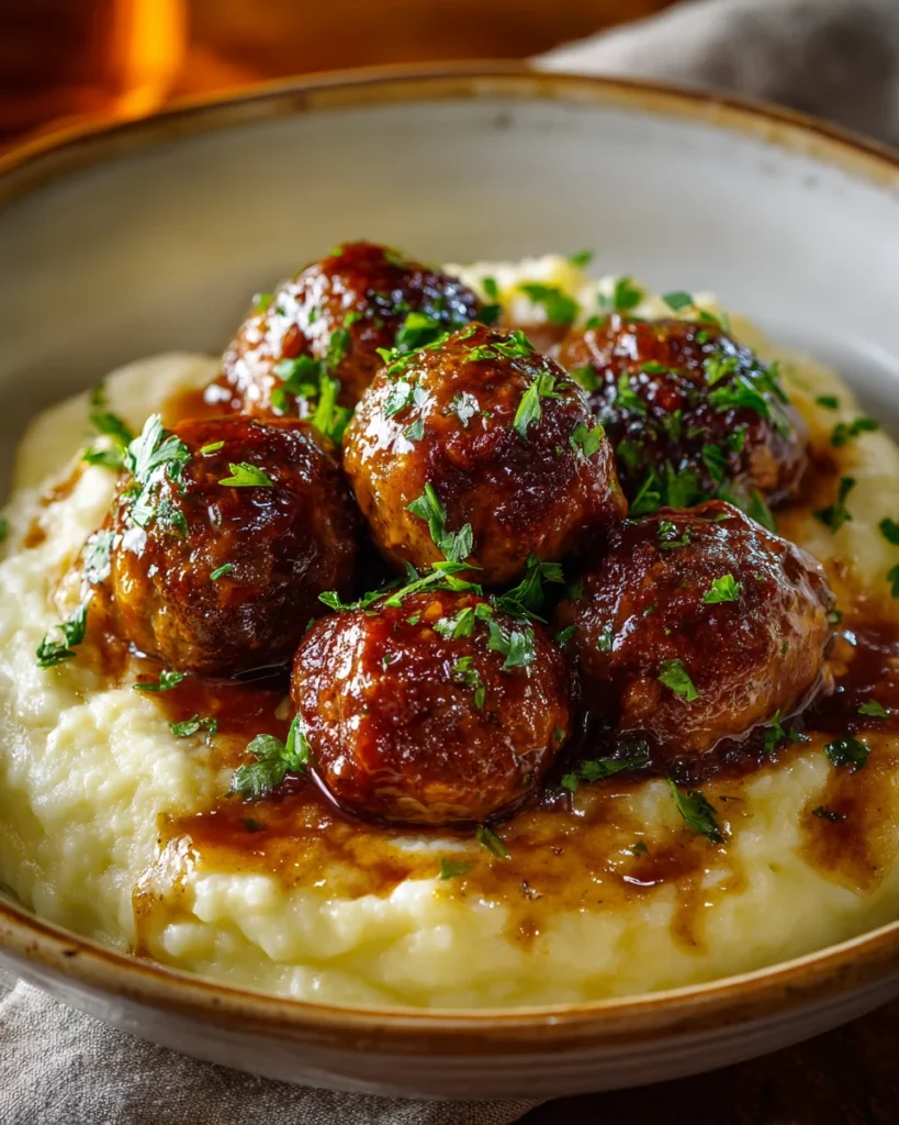 Salisbury Steak Meatballs With Garlic Herb Mashed Potatoes
