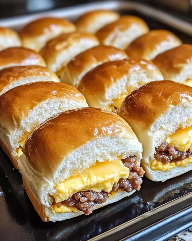 Sausage Egg and Cheese Breakfast Sliders with Syrup Glaze are the perfect morning treat, combining savory sausage and fluffy eggs within sweet Hawaiian rolls, all topped with a delicious syrup glaze.