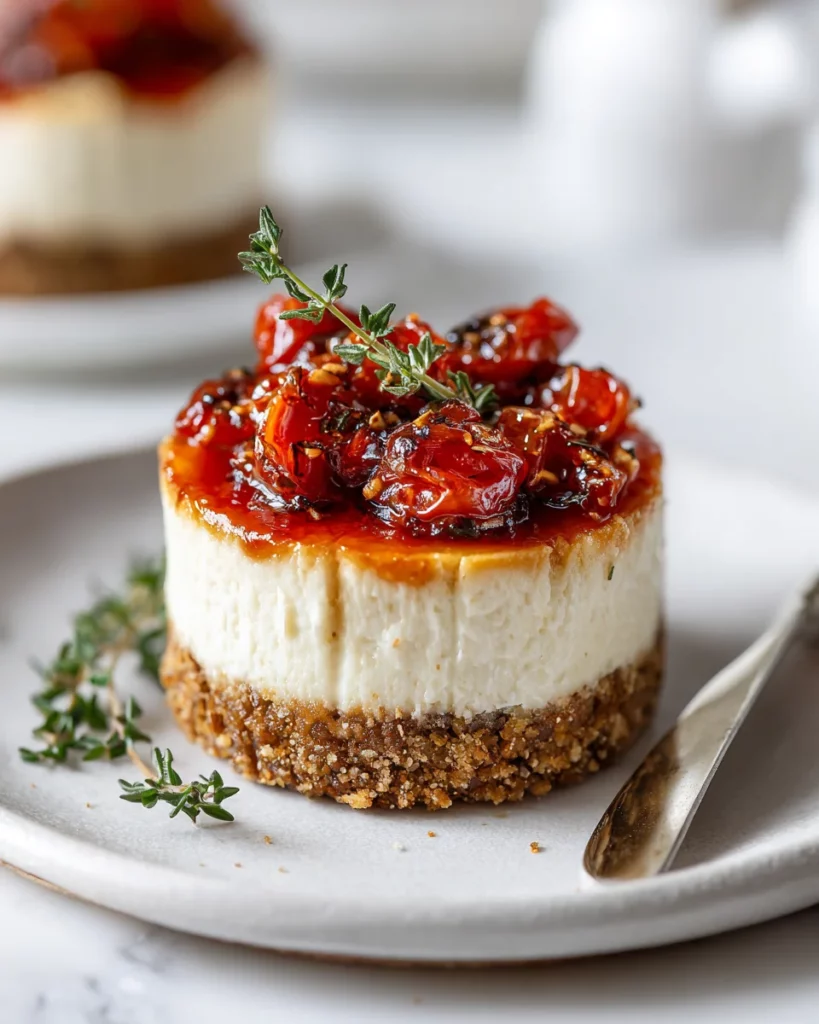 - 🎯 Spoon the cooled tomato jam over the chilled cheesecake. Garnish with thyme leaves and a light drizzle of olive oil. Slice and serve.