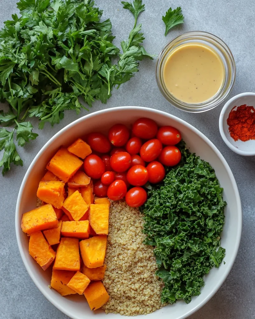Ingredients for Savory Sweet Potato Quinoa Bowl with Lemon Tahini Dressing