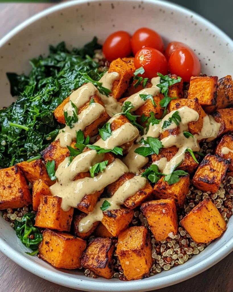 How to Prepare Savory Sweet Potato Quinoa Bowl with Lemon Tahini Dressing