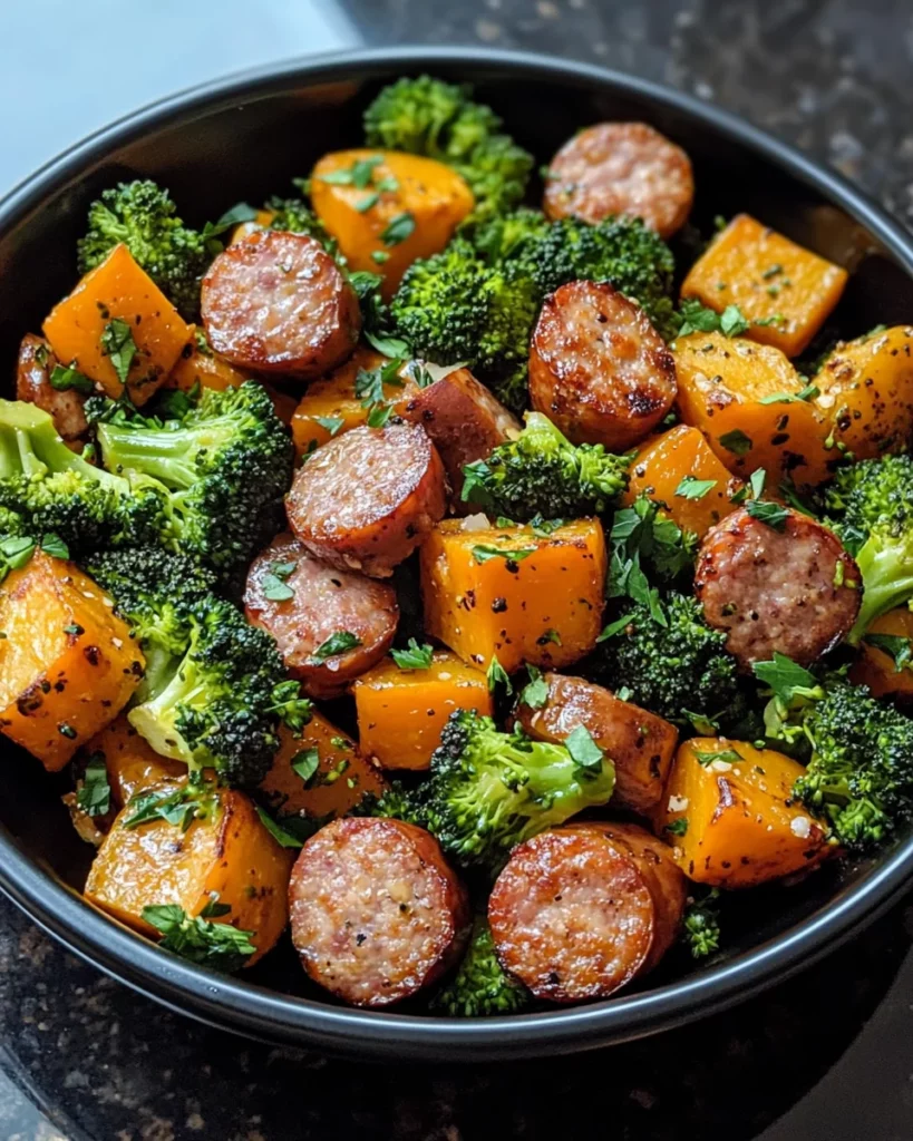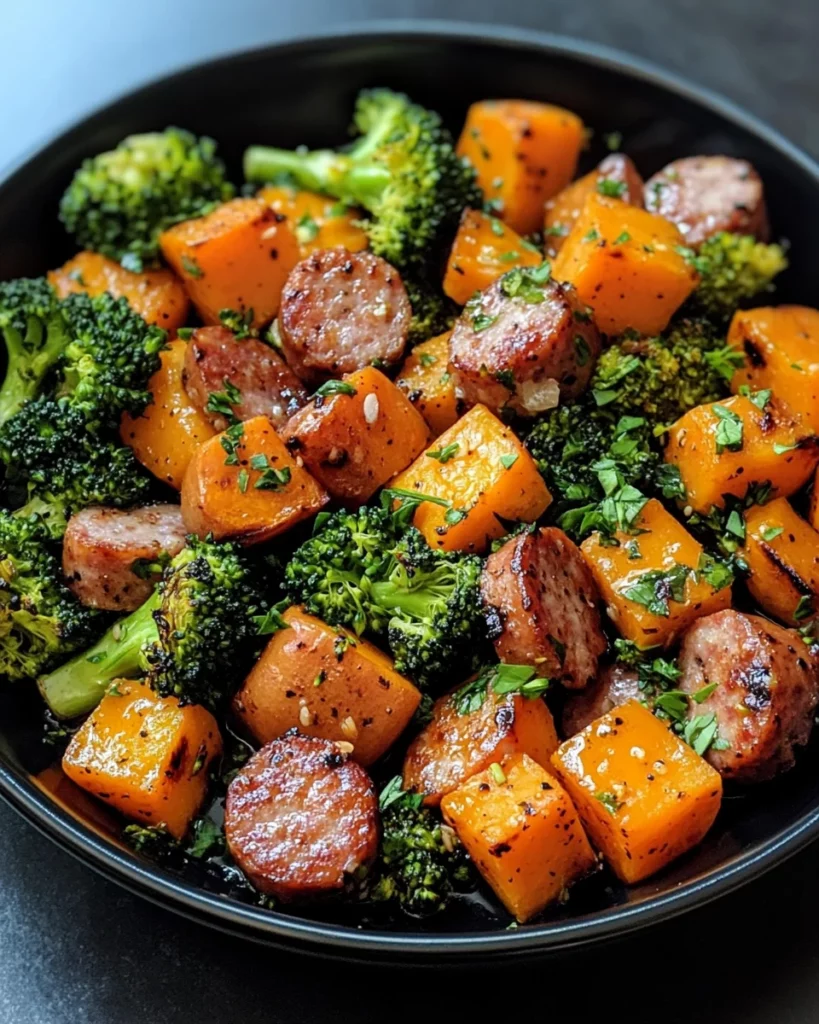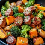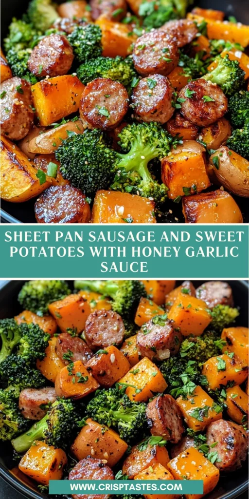 A delicious and easy sheet pan dinner featuring sausage, sweet potatoes, and broccoli, all coated in a flavorful honey garlic sauce.