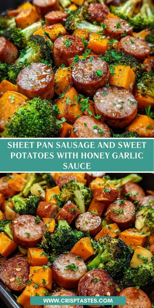 A delicious and easy one-pan meal featuring sausage, sweet potatoes, and broccoli, all coated in a flavorful honey garlic sauce.