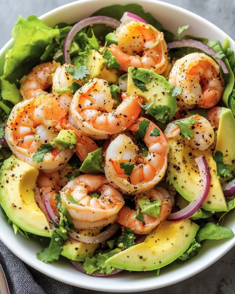 - Assemble the Salad: Add the steamed shrimp to the bowl with the dressing. Toss in the shredded lettuce and diced red onion, mixing well to coat everything in the dressing. Arrange the avocado slices around the shrimp, and garnish with chopped cilantro.