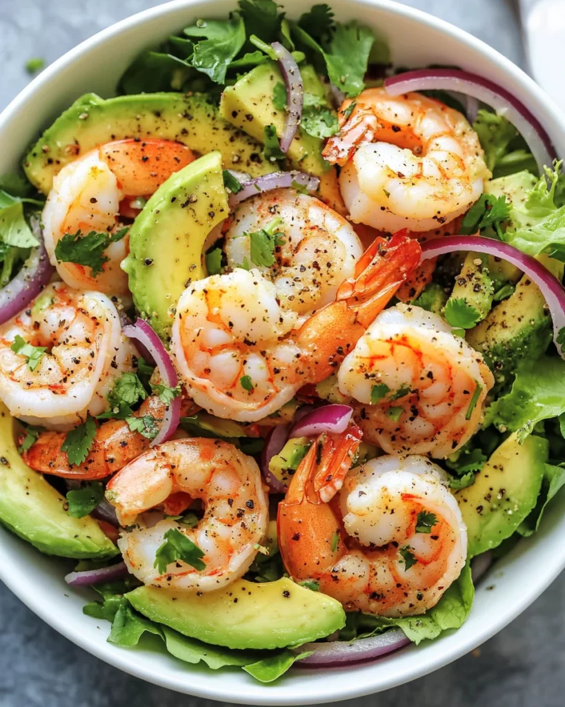 - Assemble the Salad: Add the steamed shrimp to the bowl with the dressing. Toss in the shredded lettuce and diced red onion, mixing well to coat everything in the dressing. Arrange the avocado slices around the shrimp, and garnish with chopped cilantro.