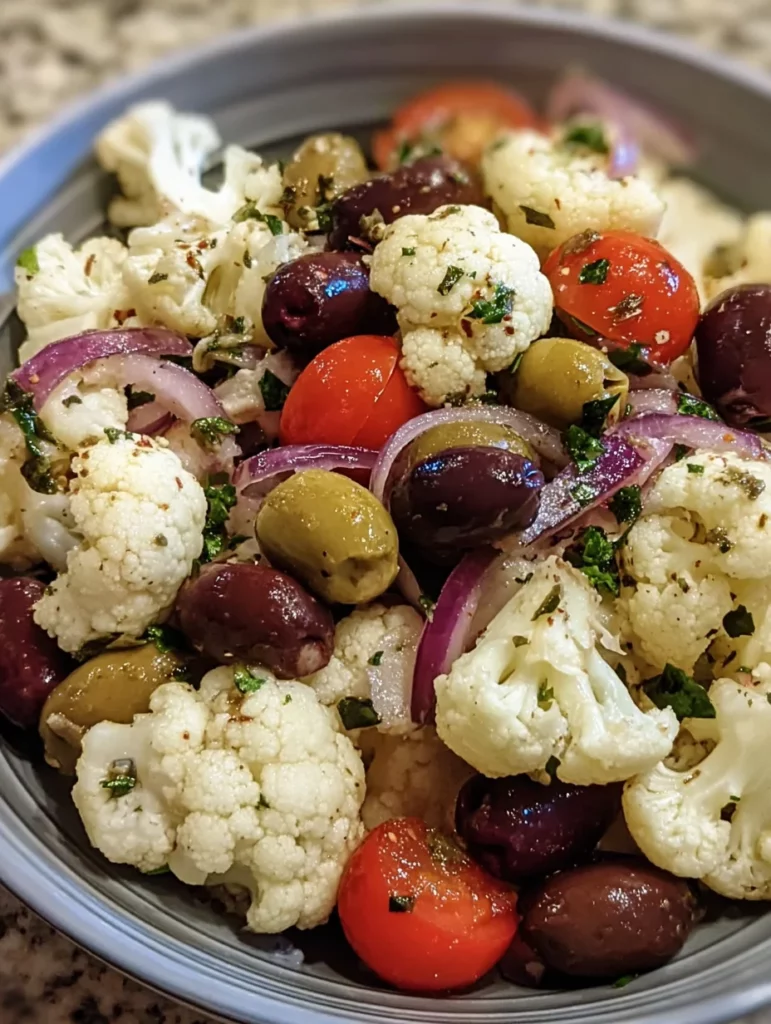 - Assemble the salad: In a large bowl, combine the blanched cauliflower, Kalamata and green olives, capers, red onion, and cherry tomatoes. Add the fresh parsley and basil, if using.