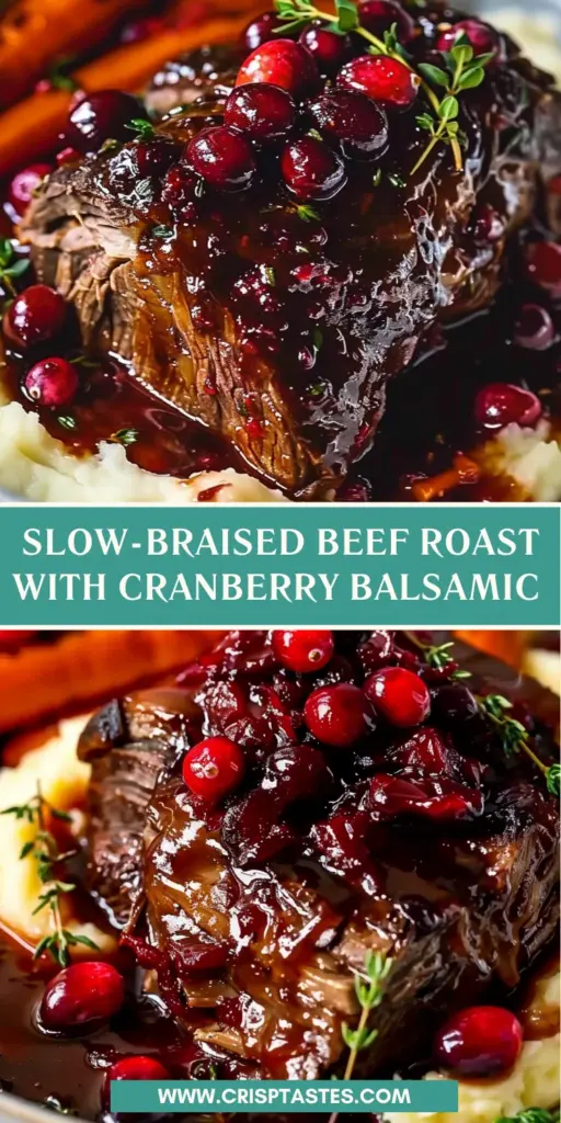 A tender and flavorful slow-braised beef roast enhanced with a sweet and tangy cranberry balsamic glaze.