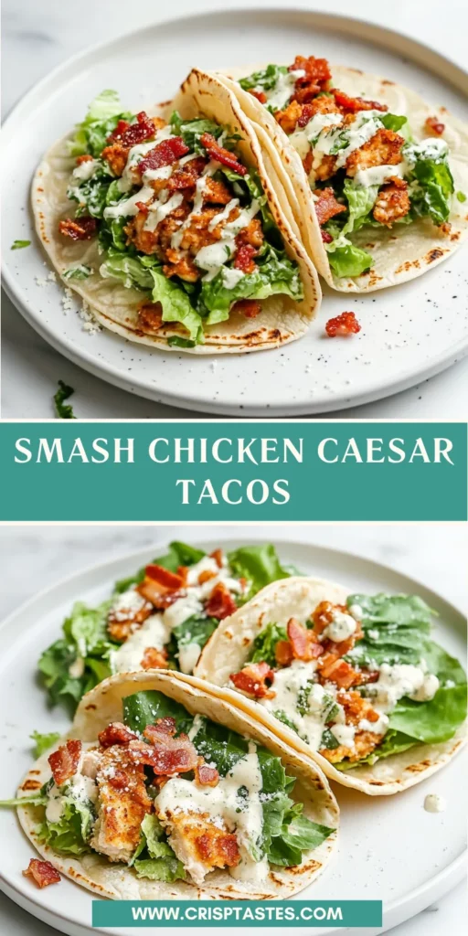 Every time I whip up Smash Chicken Caesar Tacos, I’m reminded of the joy cooking can bring. The delightful combo of flavors—from the crispy bacon to the creamy dressing—paired with the warm tortillas creates a comforting experience that every family member can appreciate. This recipe isn’t just about a meal; it’s about bringing your loved ones together and sharing laughter around the dinner table. So, whether it’s a casual weeknight or a special occasion, these tacos can turn any ordinary day into an extraordinary culinary celebration. Enjoy the deliciousness, and happy cooking!