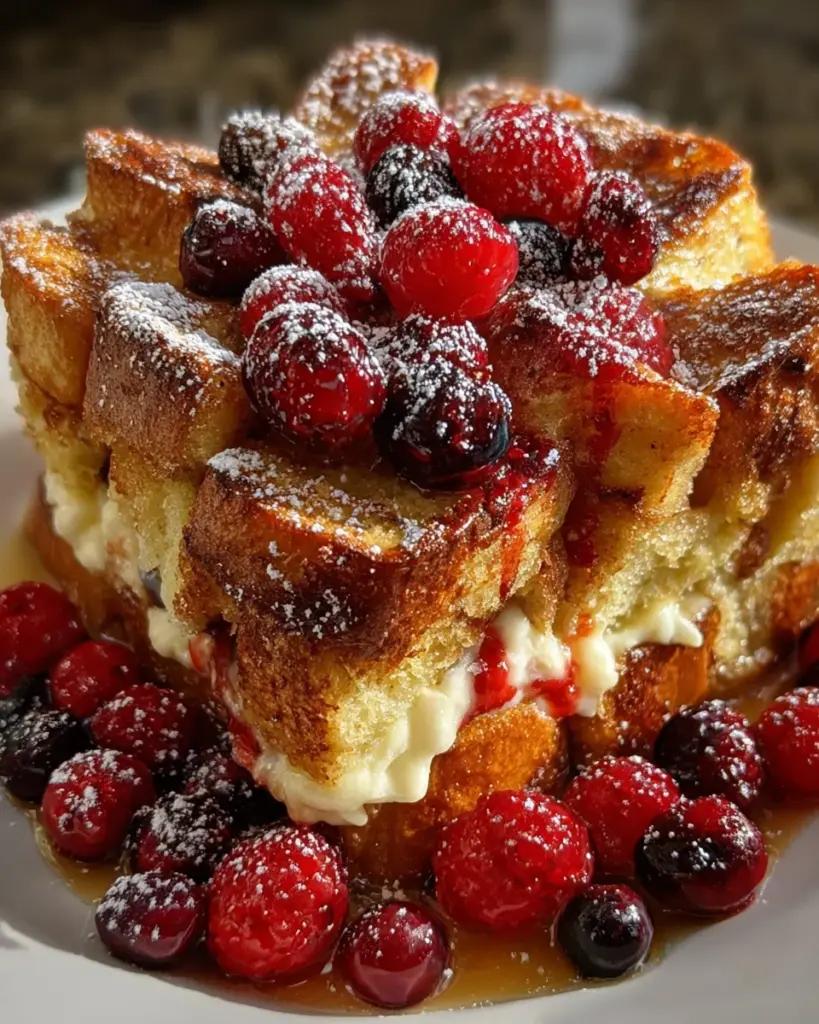 - Once baked, allow the casserole to rest for 10 minutes before serving. Top with berry compote and optional garnishes like powdered sugar or maple syrup.