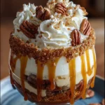 Now, it’s time to pour that heavenly milkshake into the prepared glass. Make sure to fill it just to the top for maximum indulgence! Top it generously with whipped cream—the more, the merrier! Then, give a final drizzle of caramel sauce over the whipped cream. To finish, sprinkle toasted pecans and extra graham cracker crumbs on top. You’ll have a treat that looks as good as it tastes!