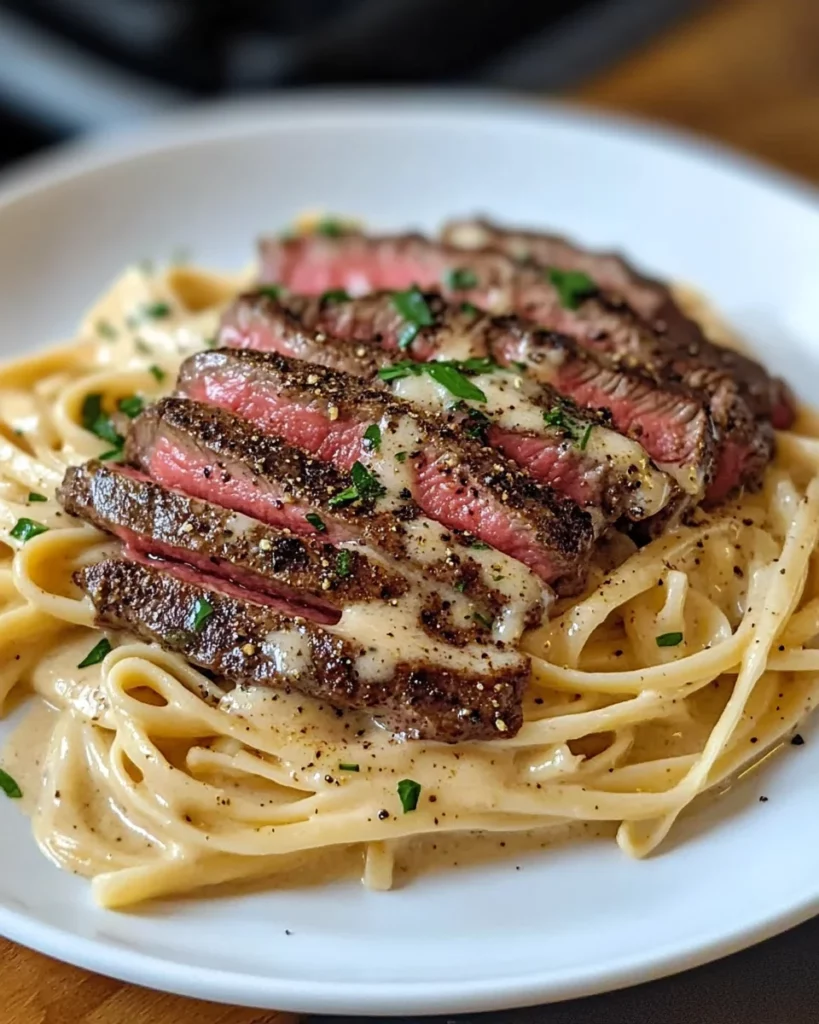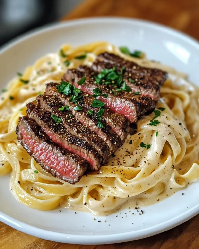 - Slice the steaks and serve over the creamy pasta, garnished with fresh parsley.