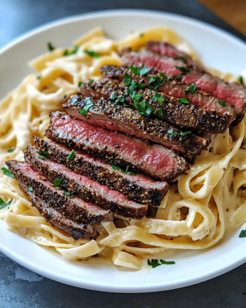 - Slice the steaks and serve over the creamy pasta, garnished with fresh parsley.
