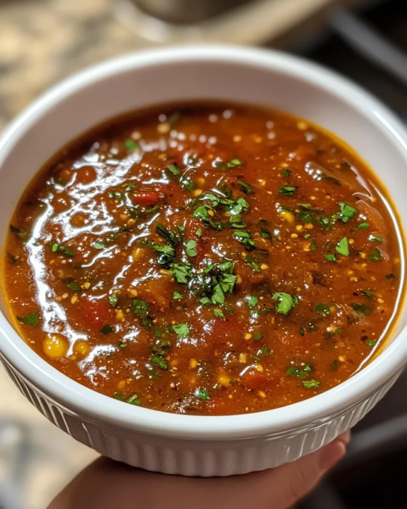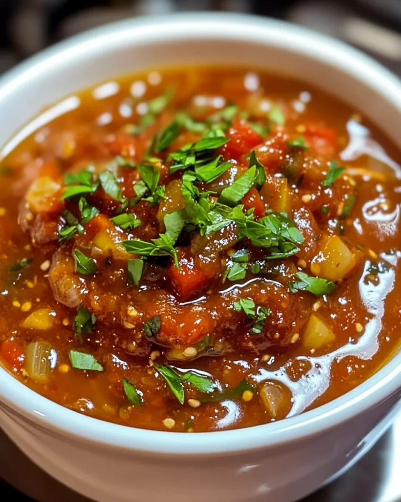 A rich and flavorful soup made with roasted red peppers and spices, perfect for a quick and comforting meal.