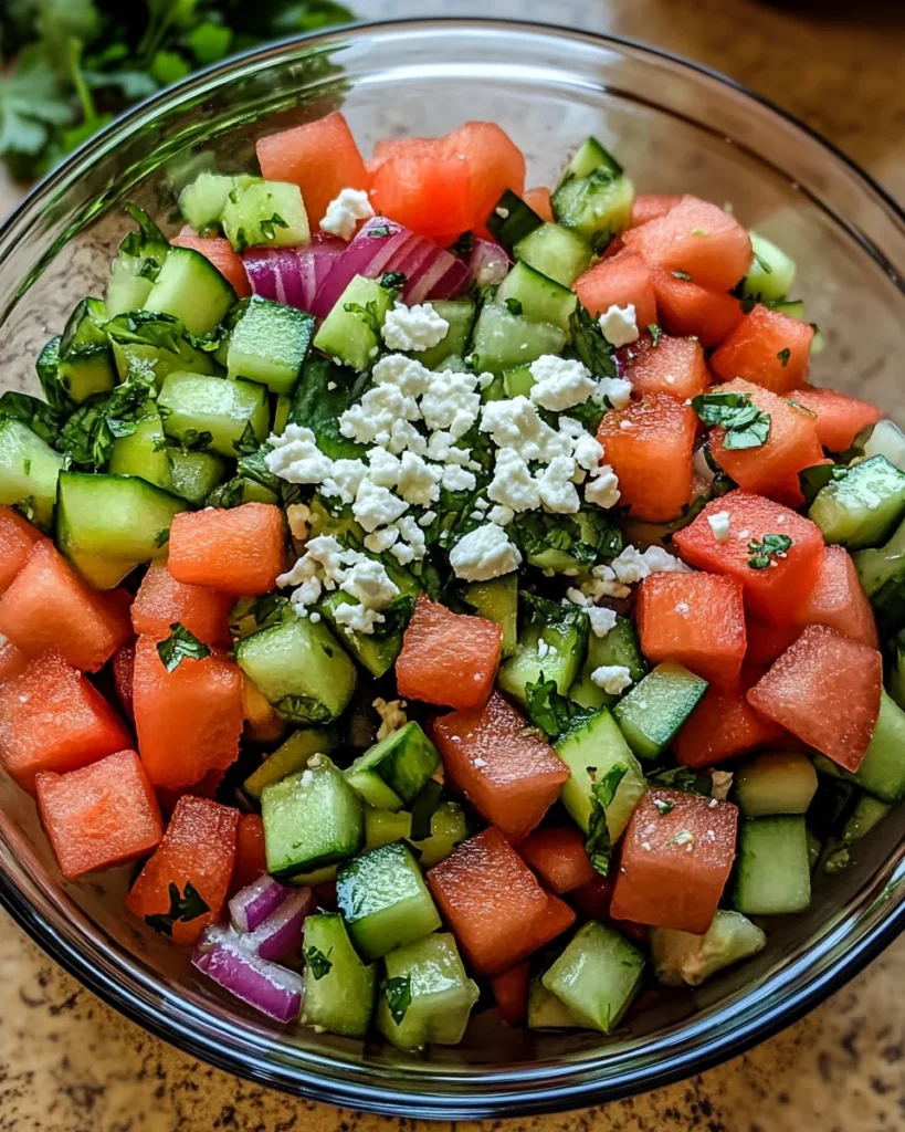 A refreshing salad combining the sweetness of watermelon with the crunch of cucumbers and a spicy kick.