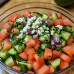 Gently fold everything together, allowing the colorful ingredients to intermingle without mashing the watermelon, keeping that lovely texture intact. Go ahead—let your hands dance in the bowl like a salad conductor orchestrating a delicious symphony!