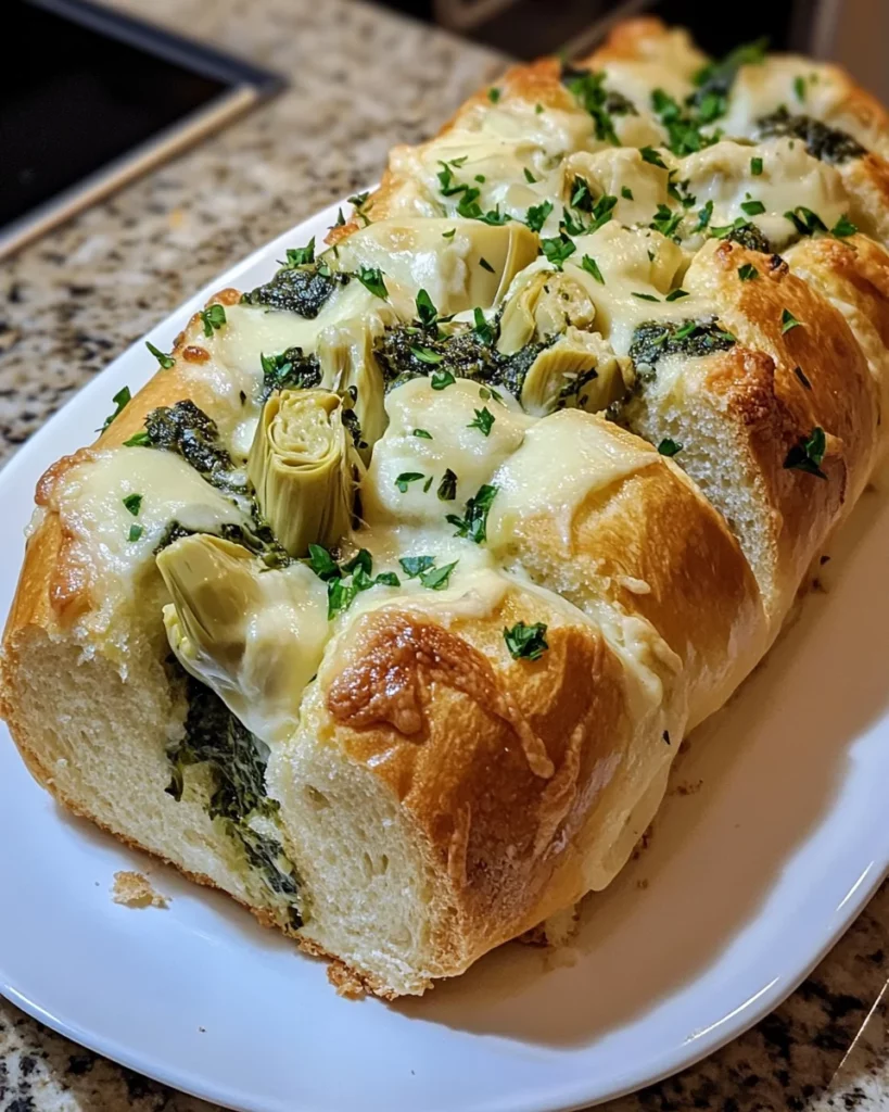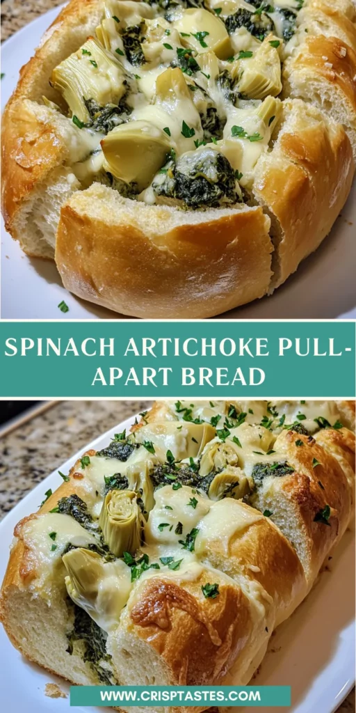 A delicious and cheesy spinach artichoke pull-apart bread, perfect for sharing at gatherings or as an appetizer.