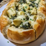 - Gently pull apart the sections of the bread and stuff the spinach artichoke mixture between the cuts, ensuring an even distribution.