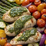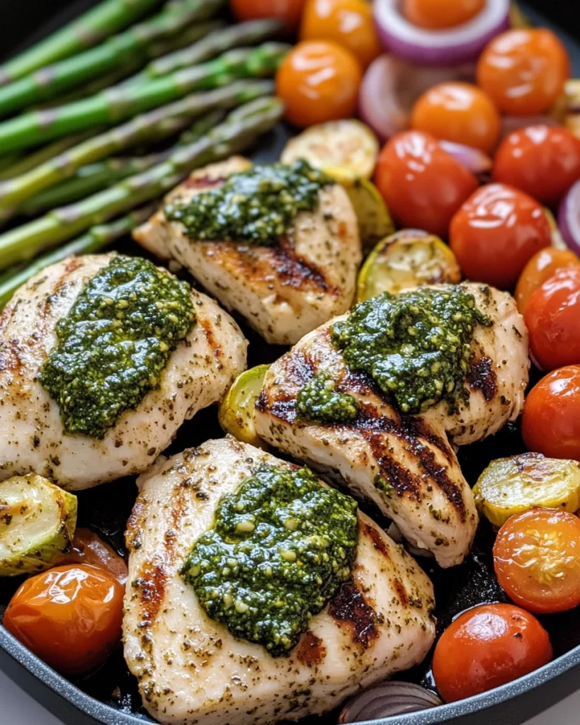 - Assemble and Serve: Once the chicken is done, spread a generous layer of pesto over each piece. Serve alongside the roasted veggies and garnish with extra Parmesan cheese or fresh basil if desired.