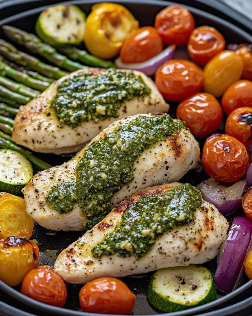 - Assemble and Serve: Once the chicken is done, spread a generous layer of pesto over each piece. Serve alongside the roasted veggies and garnish with extra Parmesan cheese or fresh basil if desired.