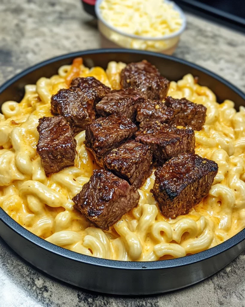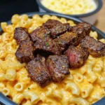 Steak Bites with Mac N Cheese is a delicious dish combining tender, flavorful steak bites with creamy, cheesy pasta.