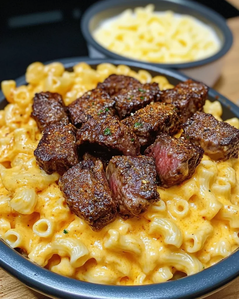Steak Bites with Mac N Cheese is a delicious dish combining tender, flavorful steak bites with creamy, cheesy pasta.
