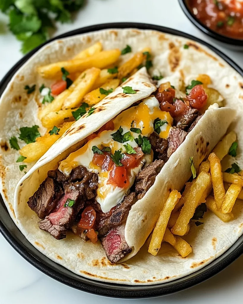 Steak & Cheese Dirty Fry Burritos are a delicious fusion of steak, crispy fries, and melted cheese wrapped in a warm tortilla, topped with a tangy sour cream and salsa mix.
