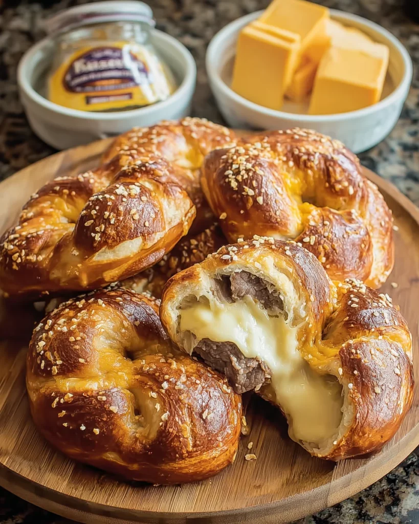Delicious pretzels filled with steak and cheese that offer a mouthwatering experience.