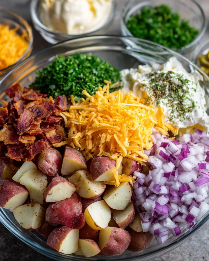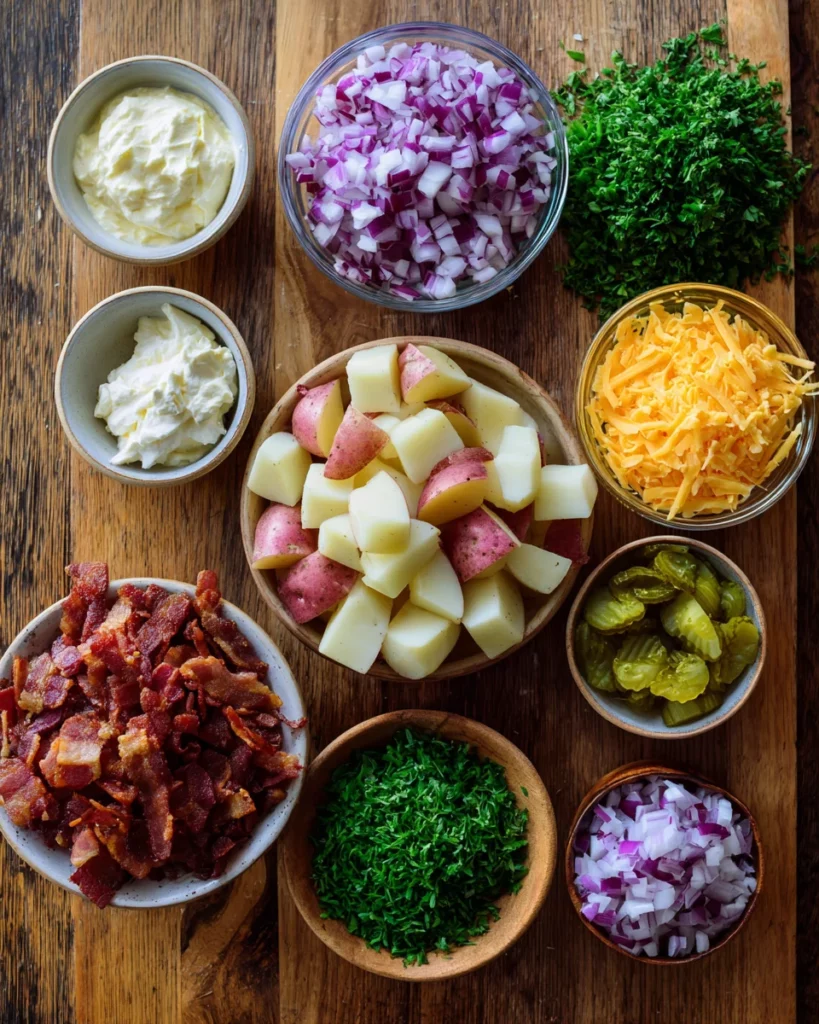 Let’s dive into the ingredients that make this Steakhouse Potato Salad Loaded a true delight! Each component adds its own unique touch, ensuring every bite is packed with flavor. Remember, the exact measurements are listed at the bottom of the article for easy printing.