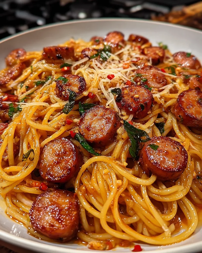 A delicious and easy-to-make pasta dish featuring sticky honey garlic sauce combined with savory sausage, perfect for a quick weeknight dinner.