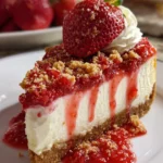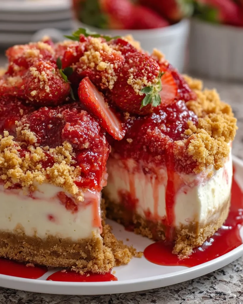 A decadent dessert that combines creamy cheesecake with a crunchy strawberry topping, perfect for any occasion.