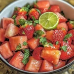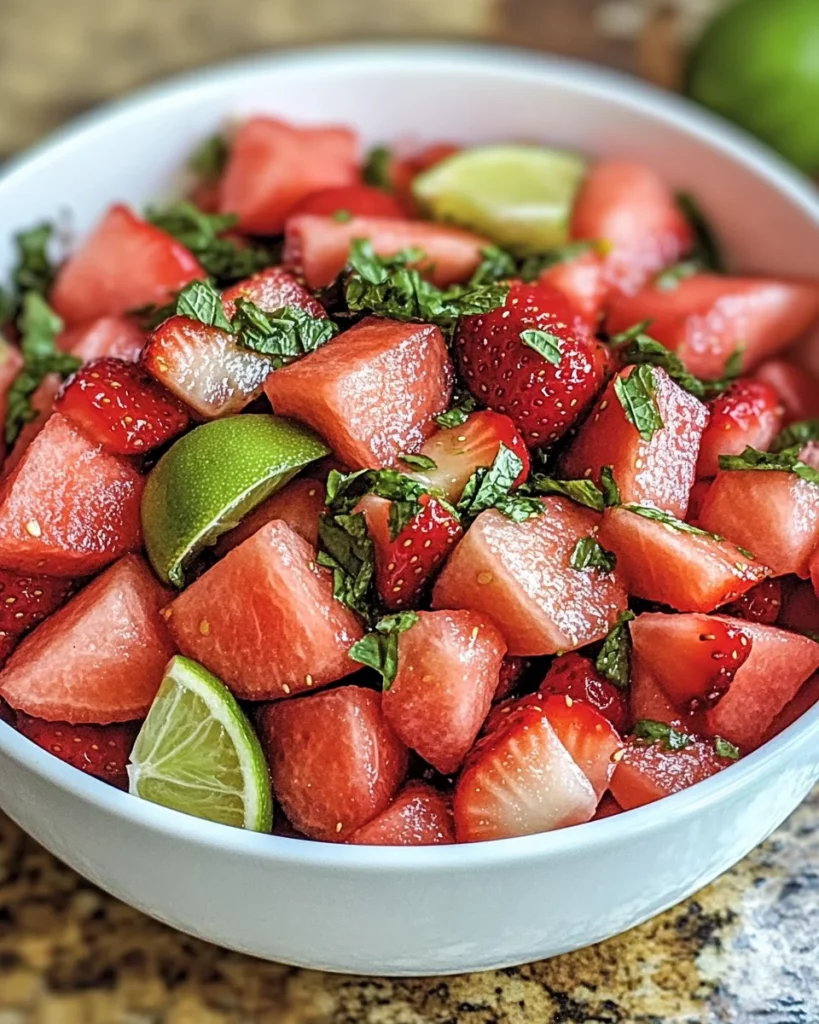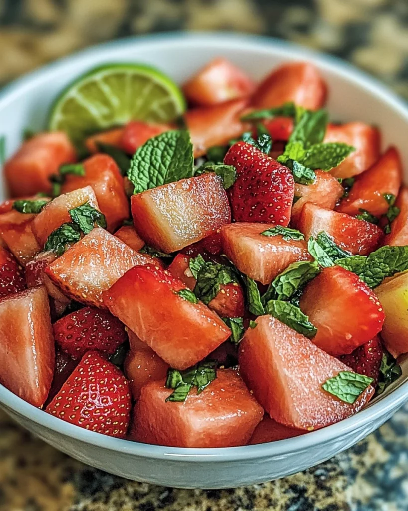 A refreshing and colorful salad perfect for summer, combining the sweetness of strawberries and watermelon with a hint of mint and lime.