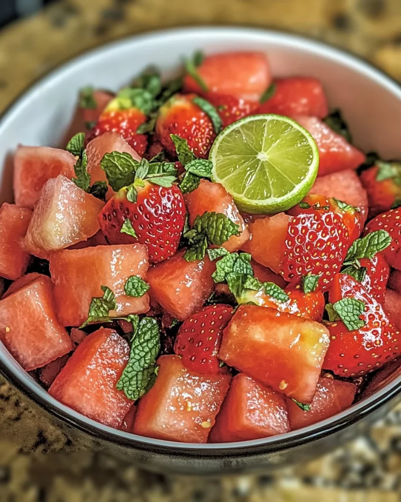 A refreshing and colorful salad perfect for summer, combining the sweetness of strawberries and watermelon with a hint of mint and lime.