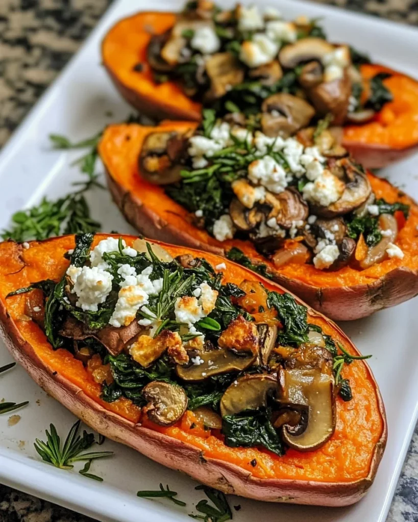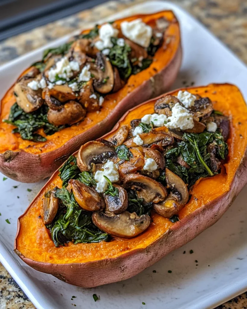 - Slice each sweet potato open and fluff the inside slightly with a fork. Fill with the spinach and mushroom mixture. Top with crumbled feta. Place back in the oven for 5–7 minutes to warm the filling and slightly melt the feta.
