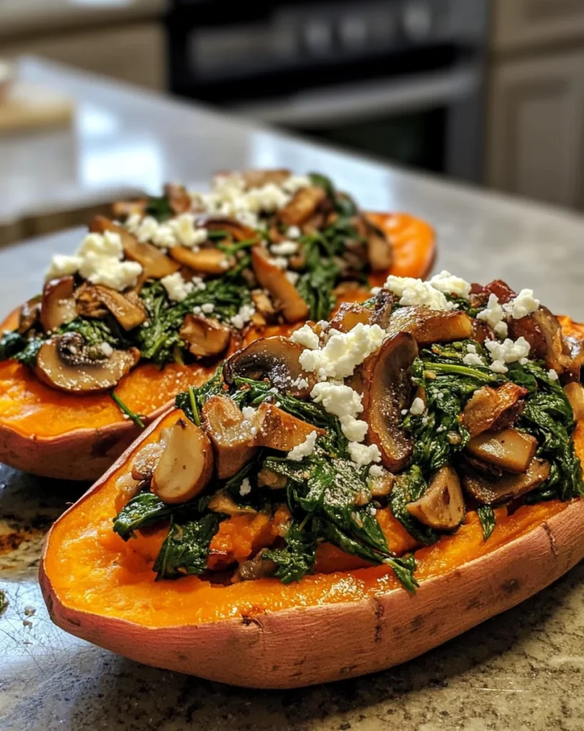 - Slice each sweet potato open and fluff the inside slightly with a fork. Fill with the spinach and mushroom mixture. Top with crumbled feta. Place back in the oven for 5–7 minutes to warm the filling and slightly melt the feta.
